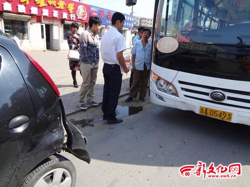 10时许,两辆车仍停在路边,比亚迪轿车后保险杠损坏,左侧已经眼看要脱落,公交车前部右侧部分凹陷。此时,保险公司工作人员已经赶到现场,正在对事故进行调查。
